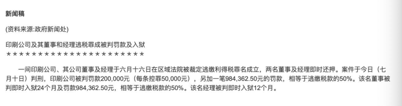 7月份香港政府新聞處發(fā)布一則新聞:《印刷公司及其董事和經(jīng)理逃稅罪成被判罰款及入獄》。具體內(nèi)容為香港一間間印刷公司、其公司董事及經(jīng)理于六月十六日在區(qū)域法院被裁定逃繳利得稅罪名成立,兩名董事及經(jīng)理即時還押。香港記賬報稅